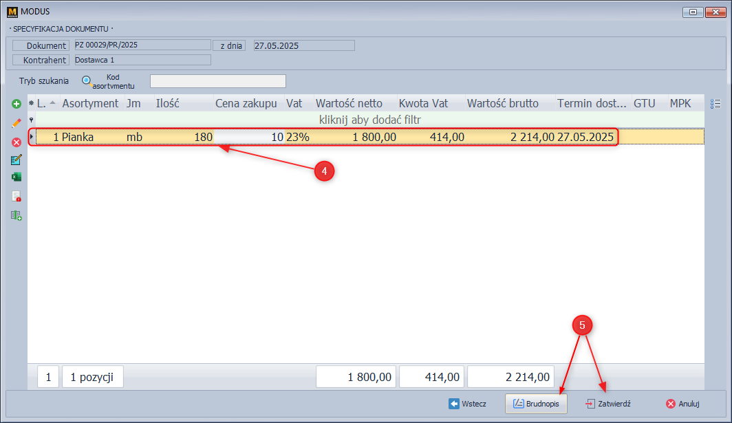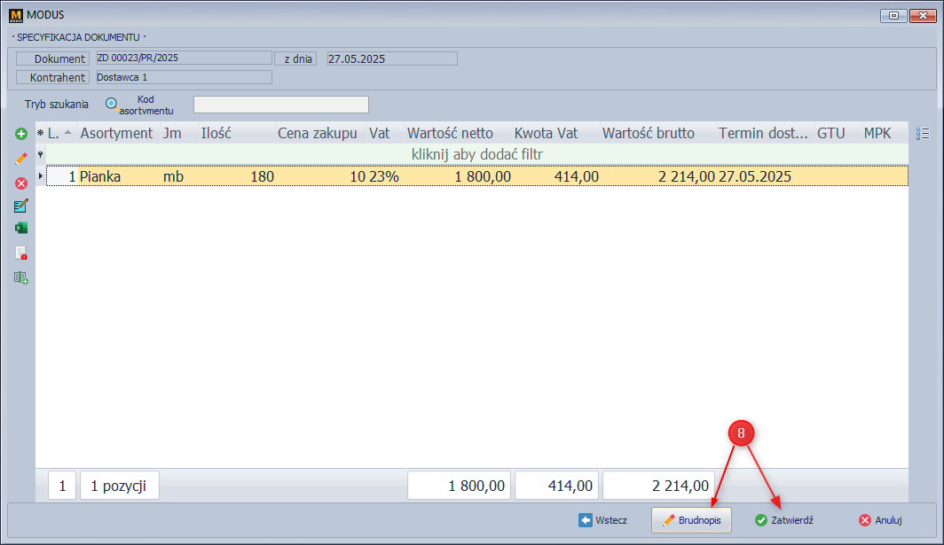- Zapisz do brudnopisu - ta opcja zapisu pozwoli wprowadzić zmiany w zamówieniu zakupu.