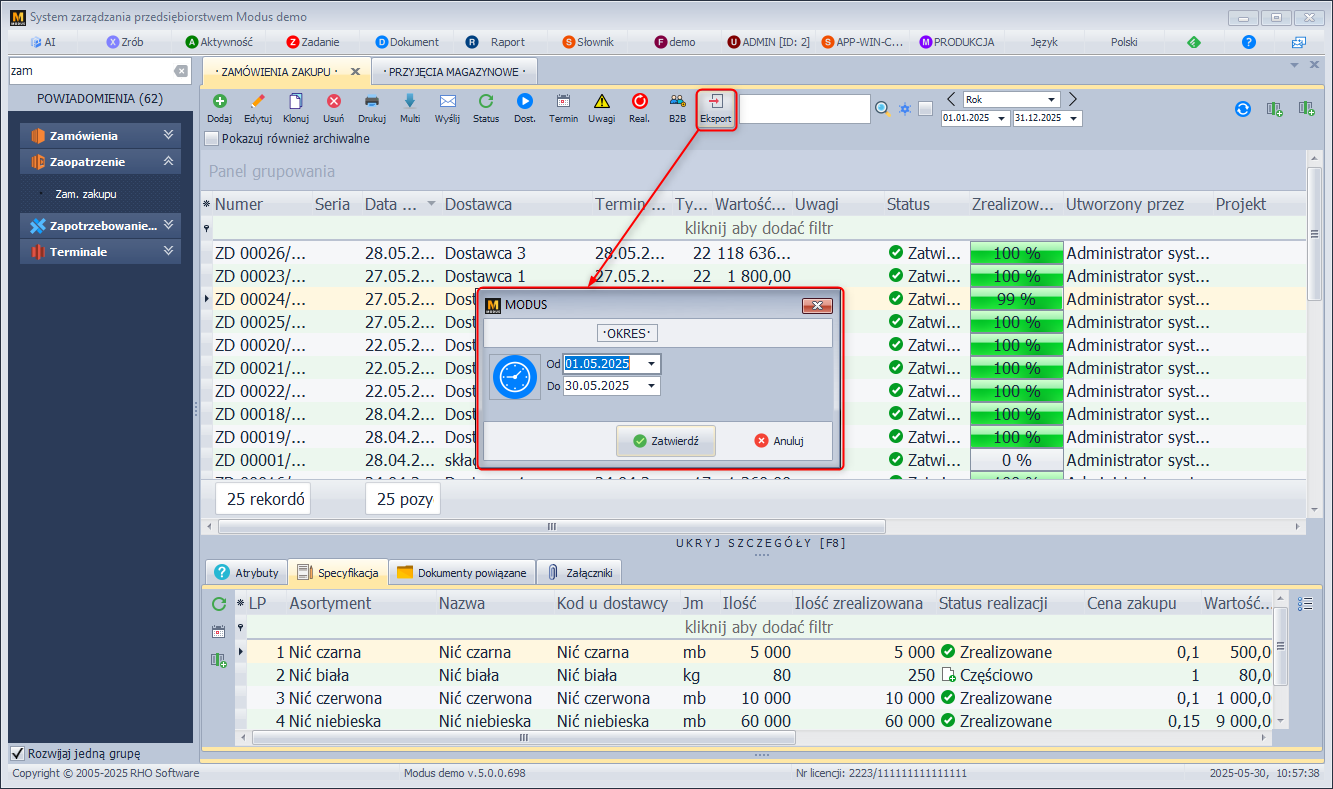 Funkcja umożliwia eksport dokumentów ZD z wybranego okresu (do systemu Navision).