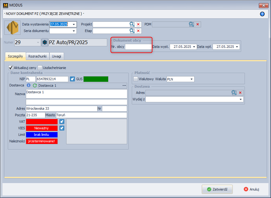 - Spowoduje to otworzenie okna Nowy dokument PZ, w którym należy uzupełnić dane.