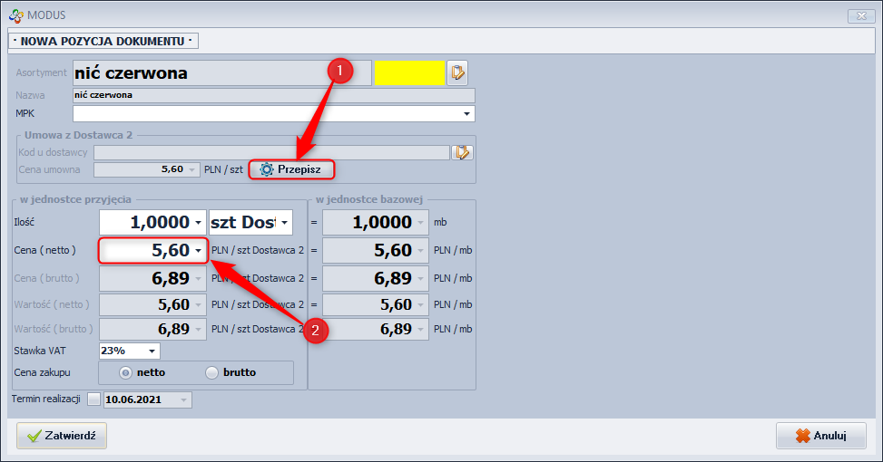 Aby umowa z dostawcą została zawarta, utwórz zamówienie zakupu. Przy następnym zamówieniu na ten sam asortyment u tego dostawcy zobaczysz poprzednią cenę asortymentu, którą możesz przepisać klikając przycisk Przepisz (Ekran 1).