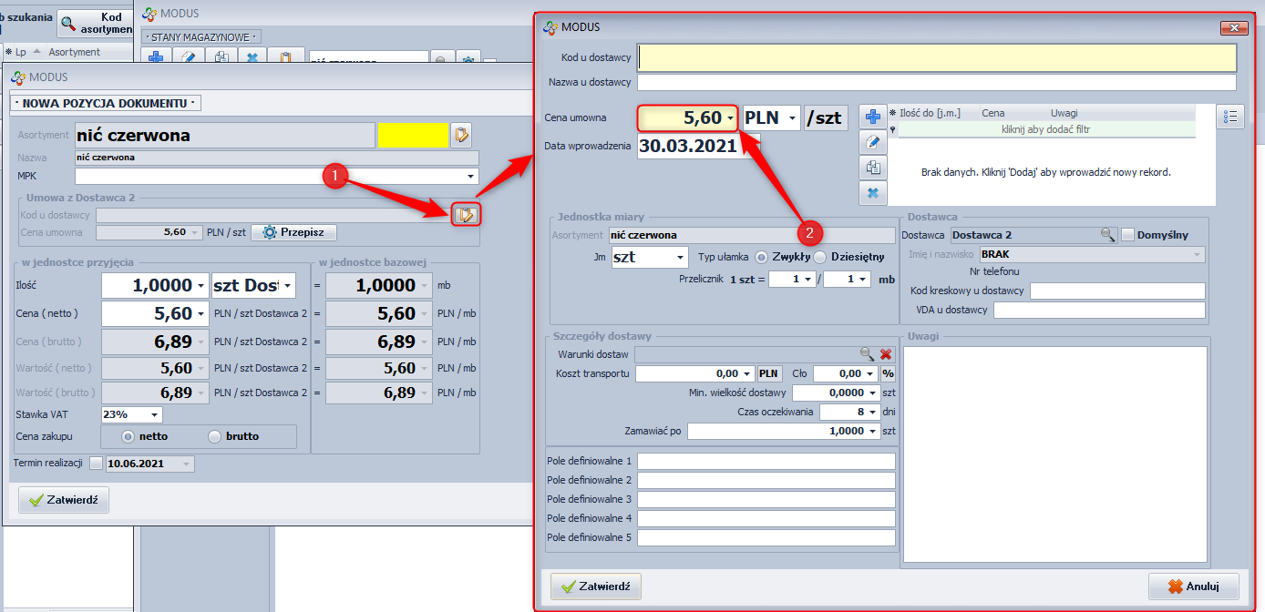 System Modus automatycznie zawiera umowy z dostawcami na dany asortyment po pierwszym zamówieniu u dostawcy. Zmiana ceny zakupu będzie aktualizowana po każdym zamówieniu.