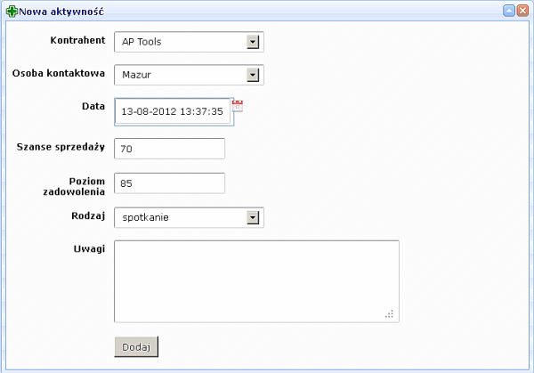 W module Kontrahenci istnieje również możliwość prowadzenia ewidencji kontaktów klientami. Służy do tego zakładka Aktywności. Prowadząc ewidencję kolejnych kontaktów z klientem można na bieżąco oceniać i rejestrować szanse sprzedaży i poziom zadowolenia klienta. W perspektywie czasu umożliwi to sprawdzenie historii kontaktów oraz uzyskanie informacji na temat słuszności podejmowanych działań.