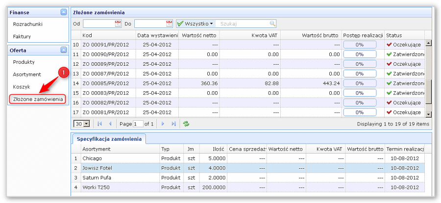 W każdej chwili mamy możliwość wglądu do naszych zamówień. Przechodzimy do zakładki: „Złożone zamówienia”. W górnym oknie wyświetla się lista zamówień oraz informacje na temat kwoty i postępu realizacji. W dolnym oknie wyświetlona zostaje specyfikacja wybranego zamówienia. Widzimy w niej listę wybranych artykułów.
