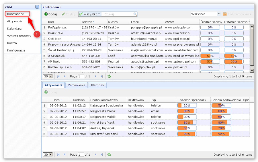 W górnym oknie widzimy listę wszystkich kontrahentów. W dolnym mamy wgląd w dane dotyczące wybranego kontrahenta: aktywności, listę zamówień i płatności danego kontrahenta.